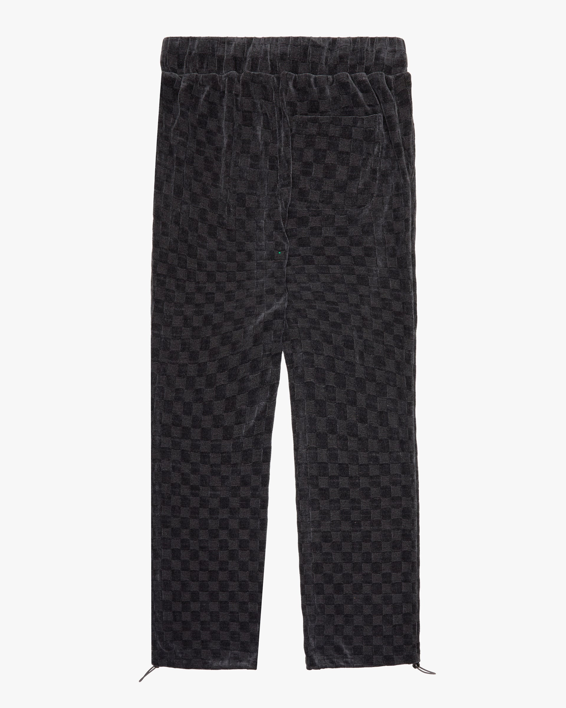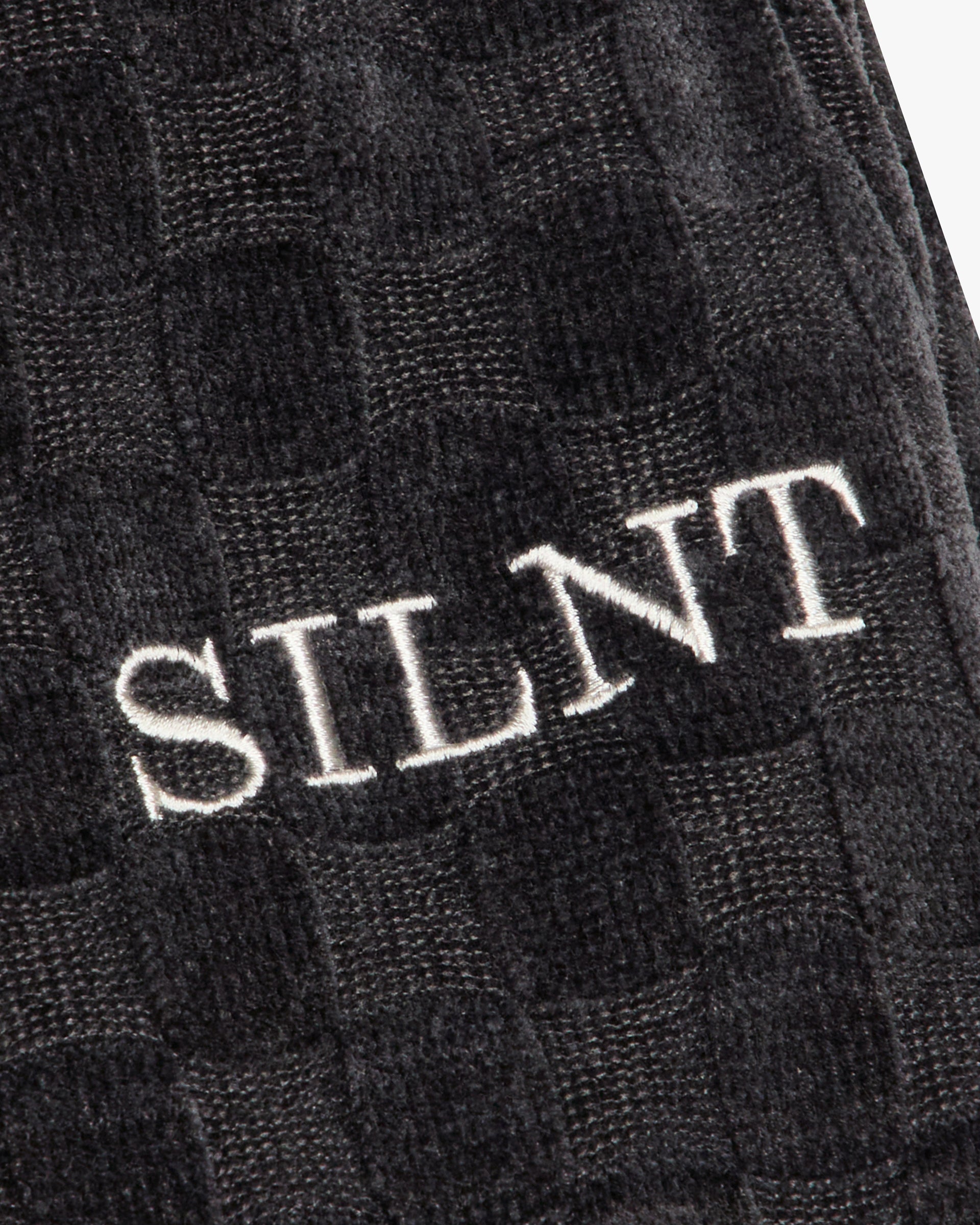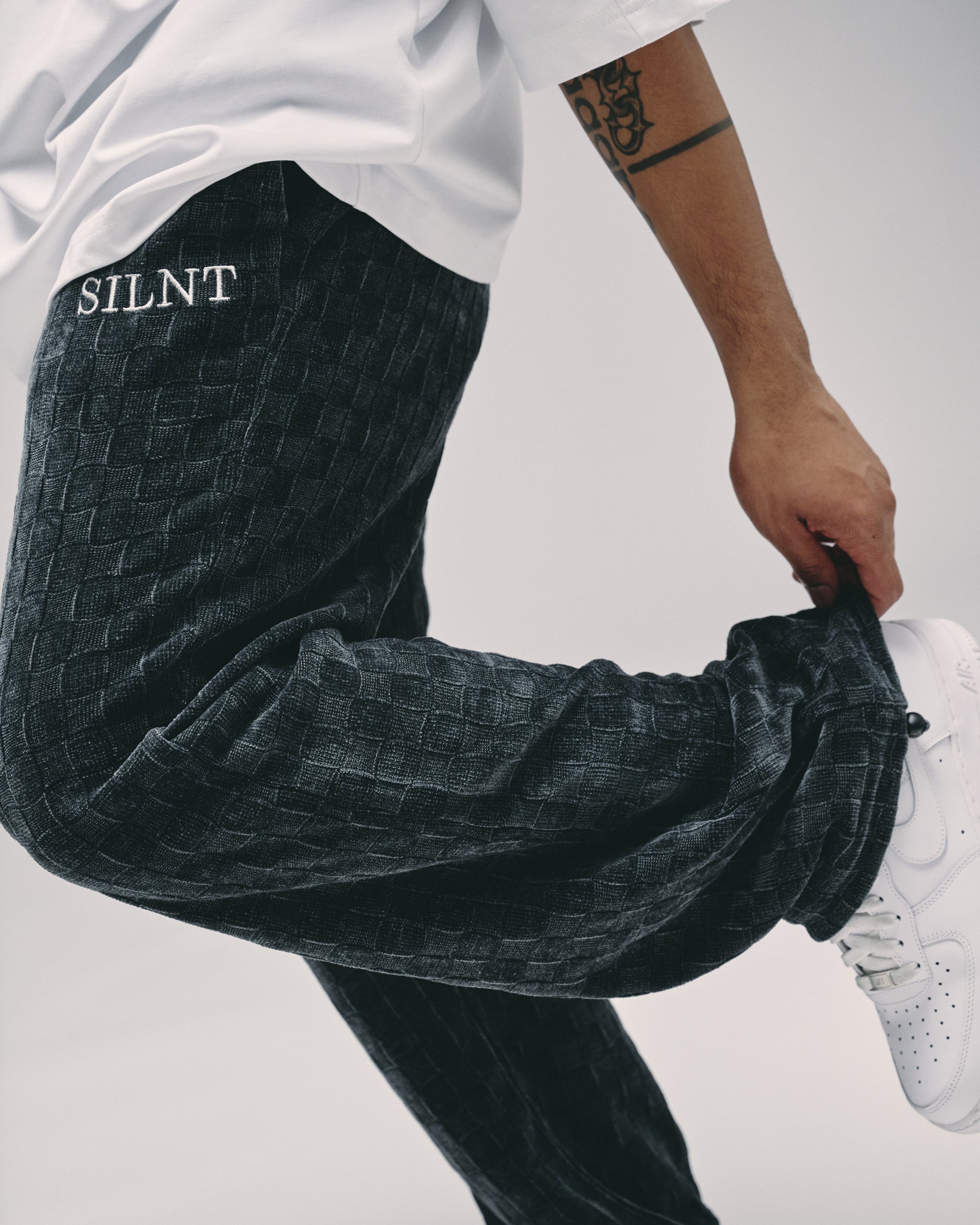 The "Checkmate" Grey Velvet Joggers bring a touch of luxury to laid-back styling. Made from plush velvet, these joggers feature a straight-leg fit for a sleek, modern silhouette. The soft texture and deep black color elevate their versatile design, perfect for casual or upscale outfits.