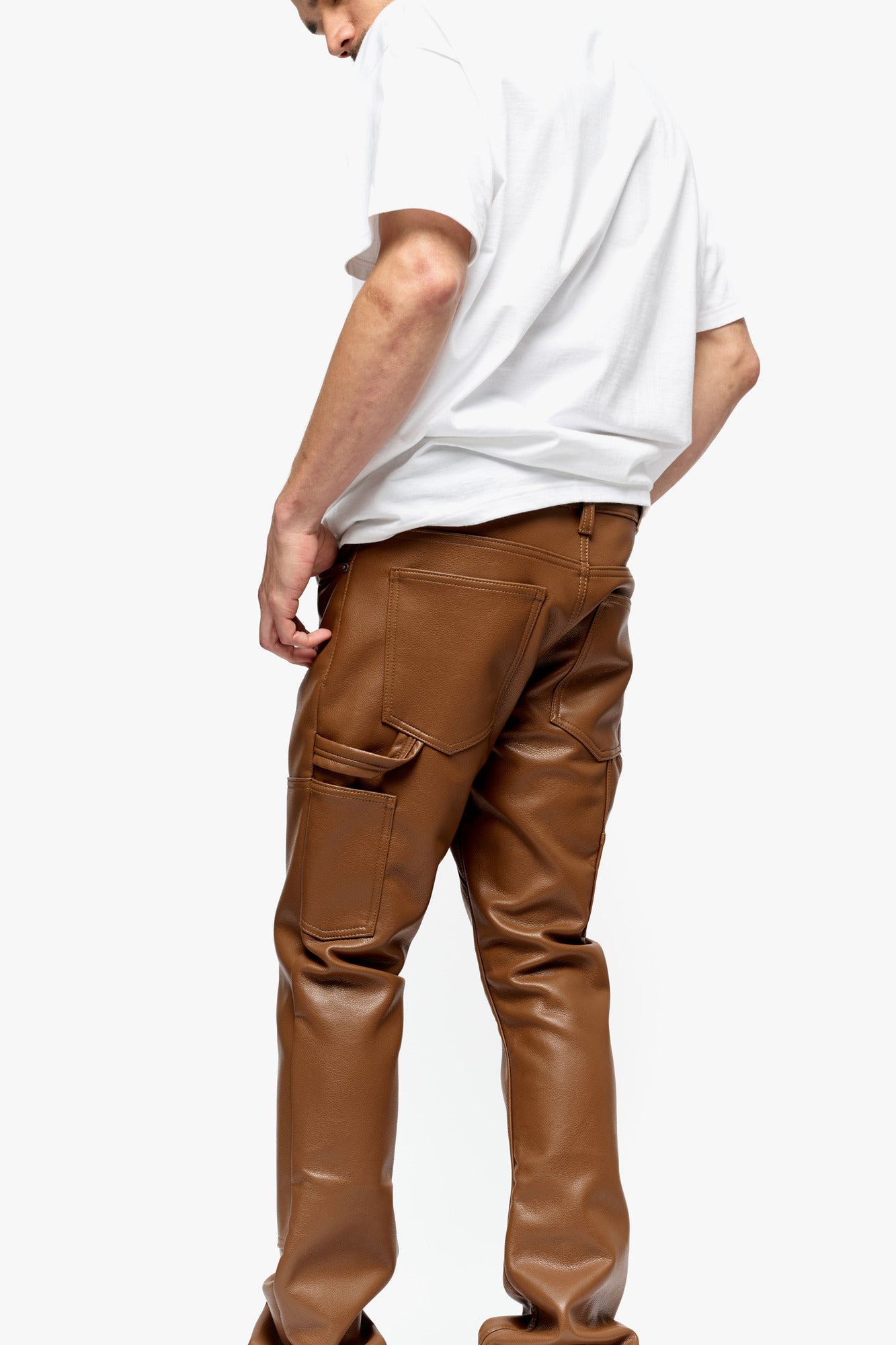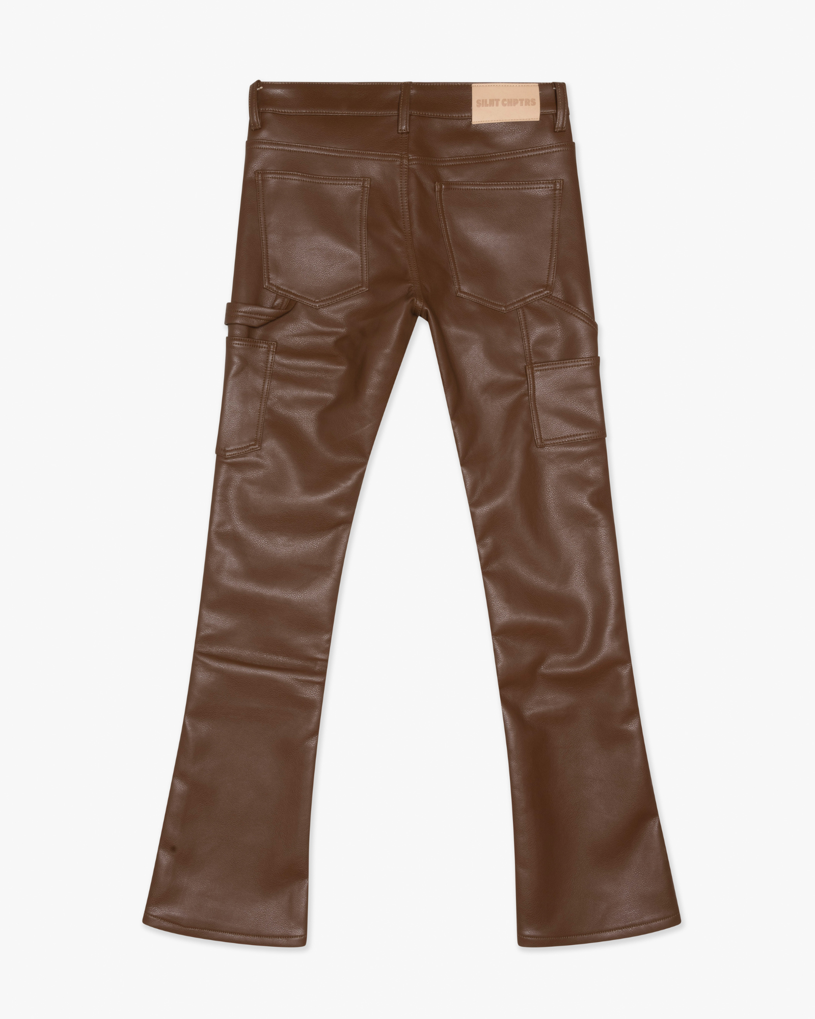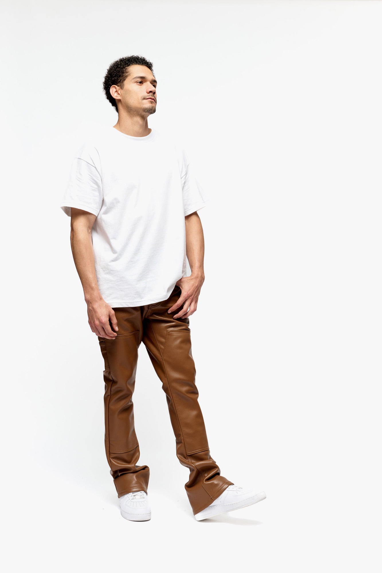 "Cuero" Brown Leather Stacked Jeans – a bold stacked-leg silhouette crafted from rich brown leather, designed for a refined yet edgy look. The structured fit allows for natural stacking at the ankles, while precise stitching and minimal detailing enhance its sleek, modern aesthetic. A statement piece that merges luxury with effortless style.