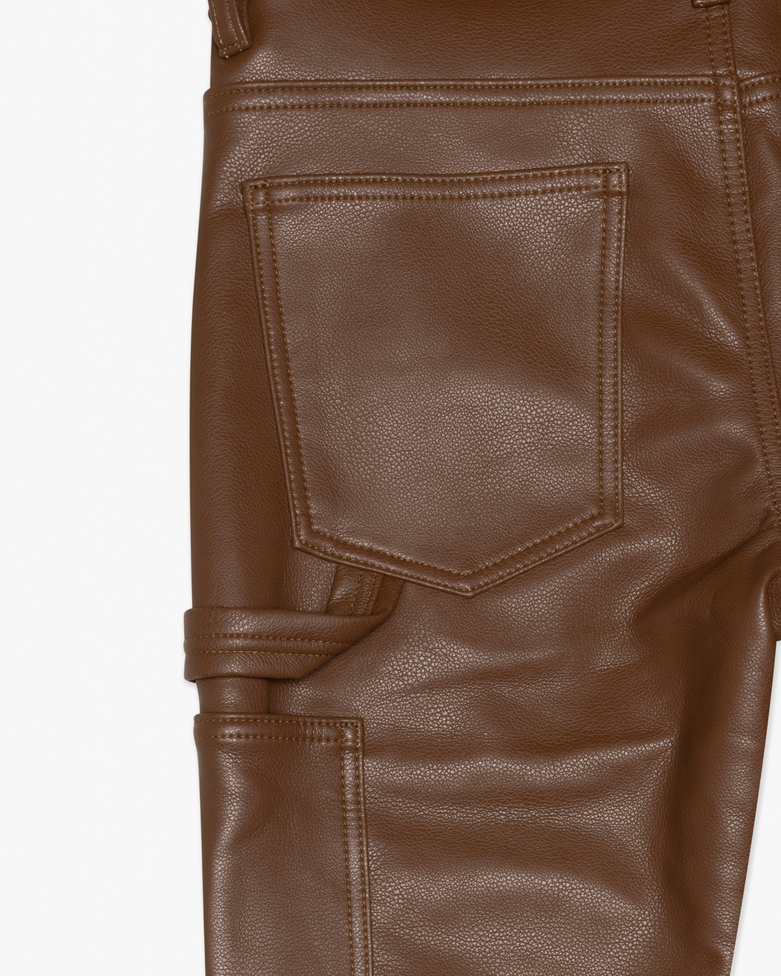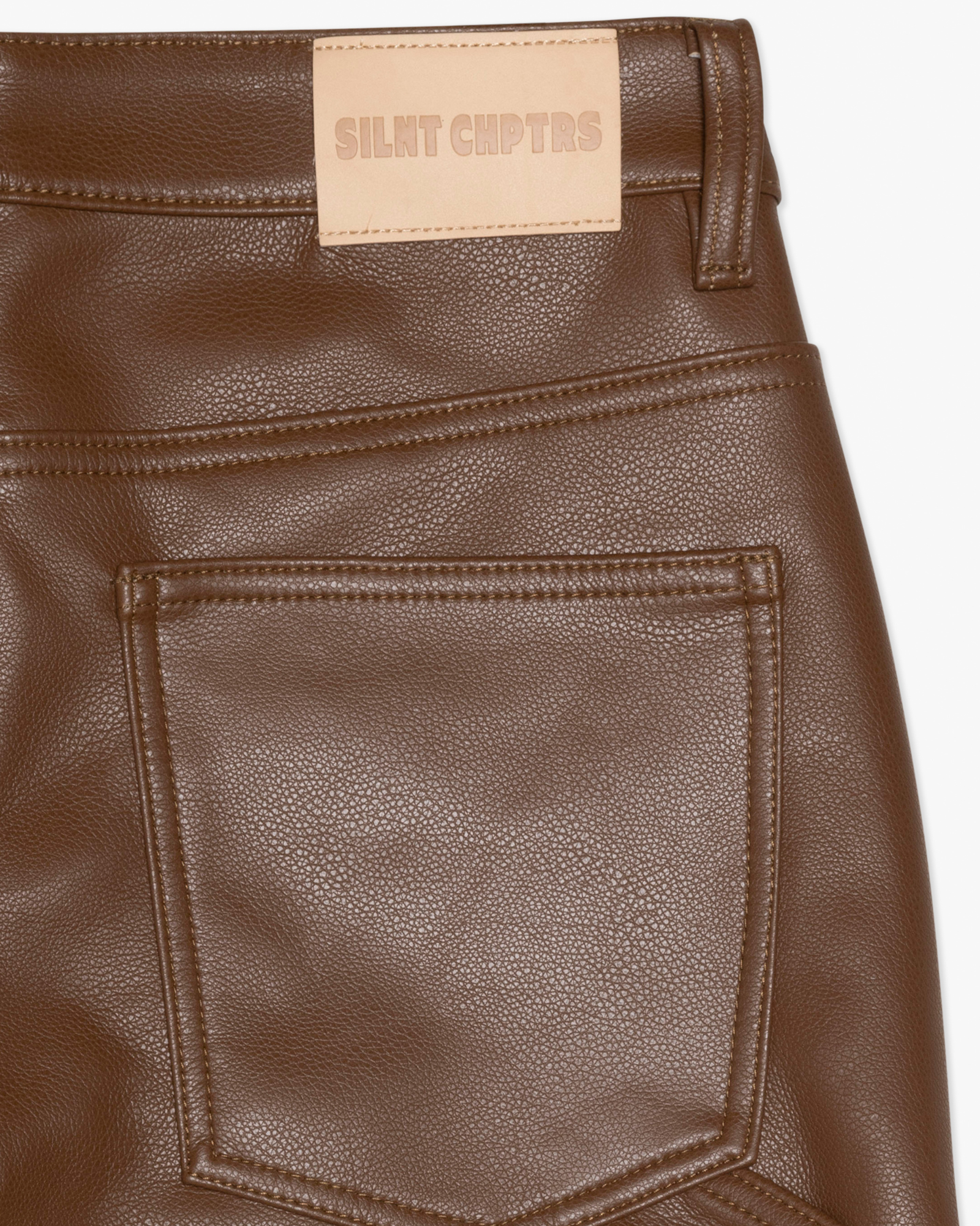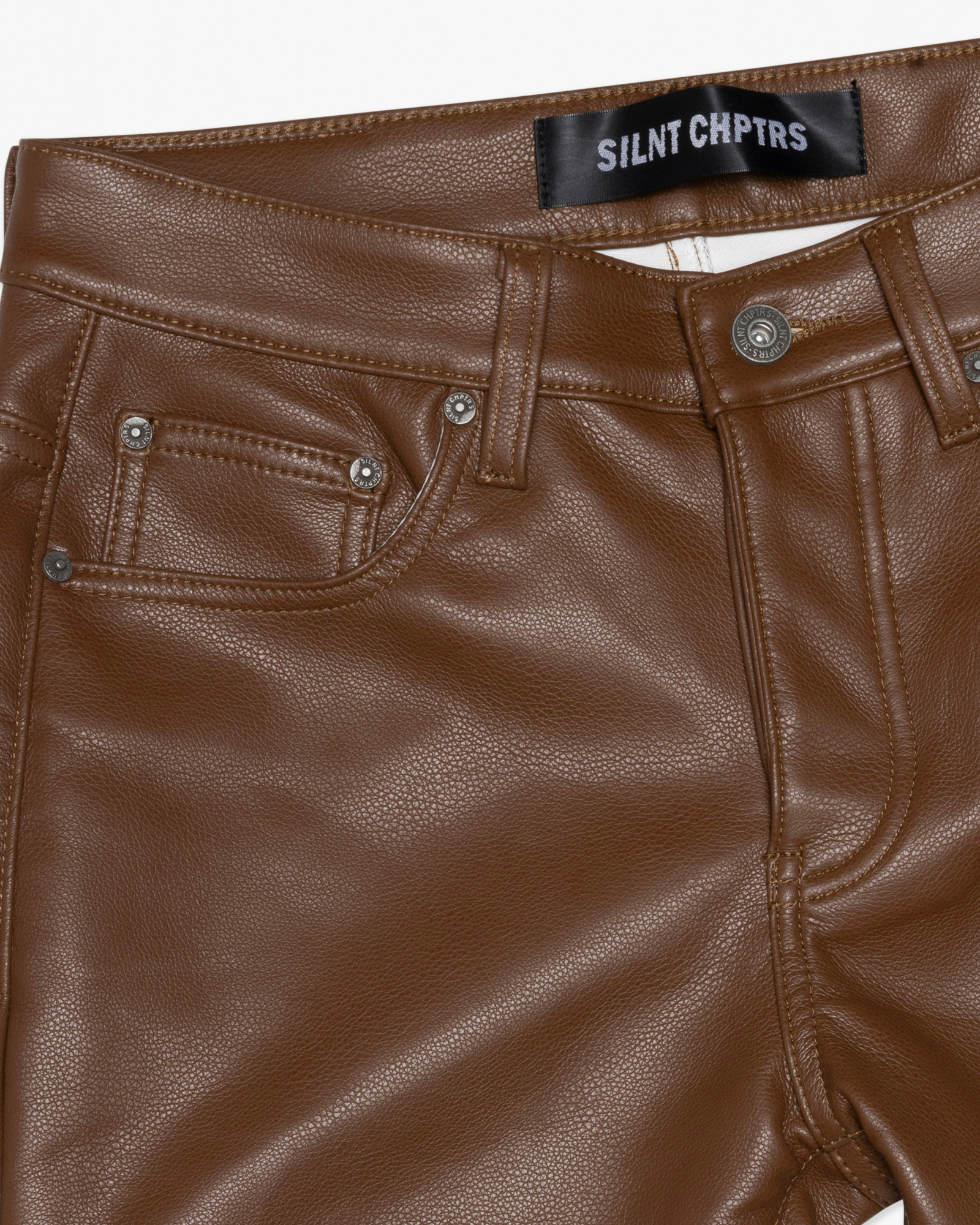"Cuero" Brown Leather Stacked Jeans – a bold stacked-leg silhouette crafted from rich brown leather, designed for a refined yet edgy look. The structured fit allows for natural stacking at the ankles, while precise stitching and minimal detailing enhance its sleek, modern aesthetic. A statement piece that merges luxury with effortless style.