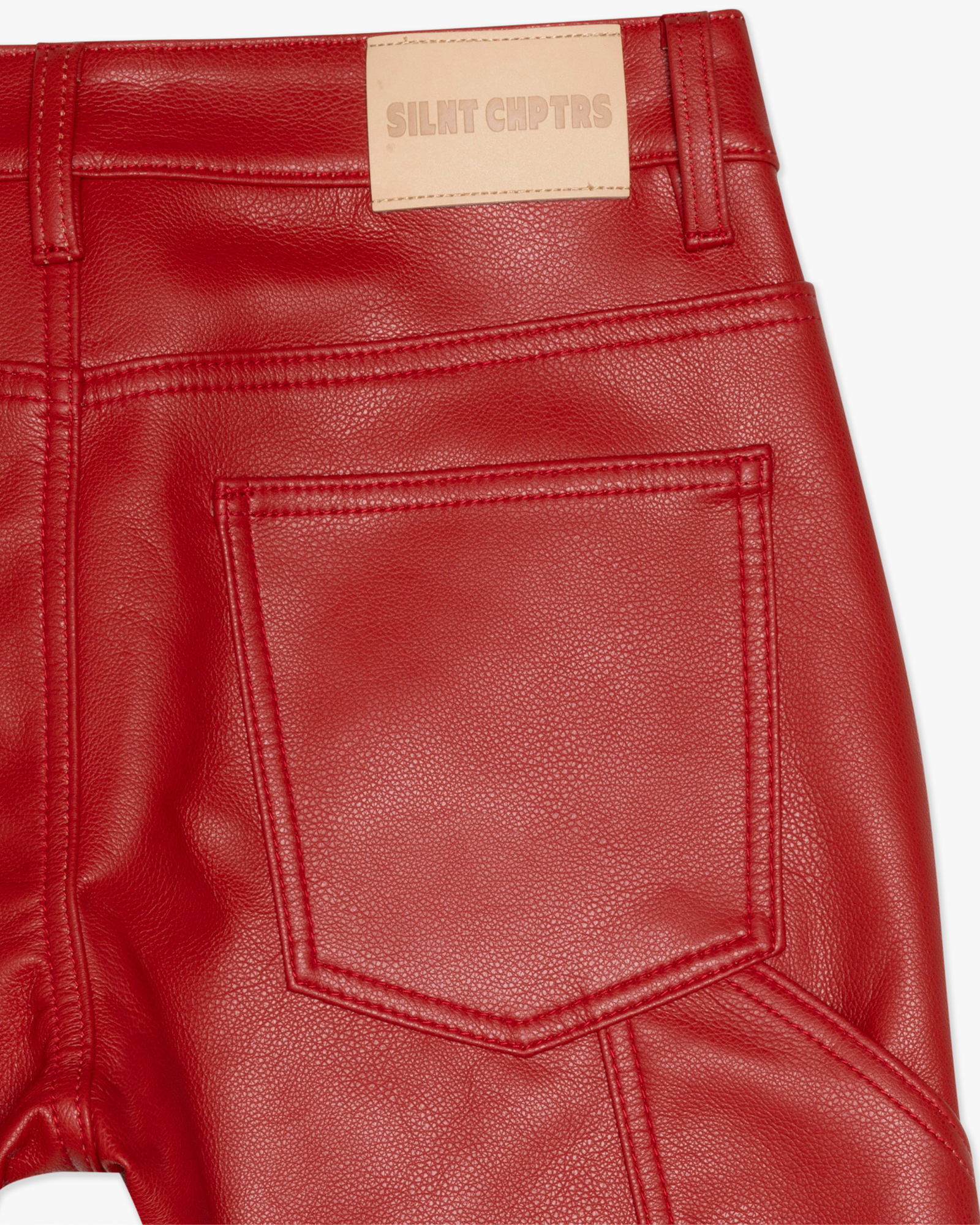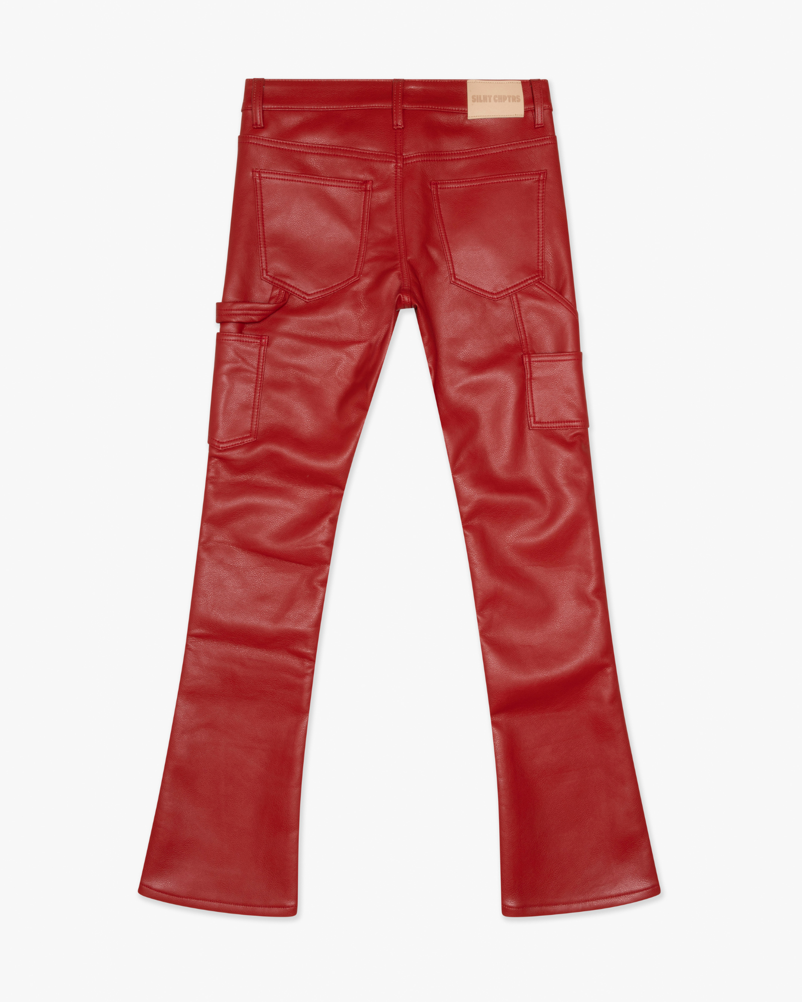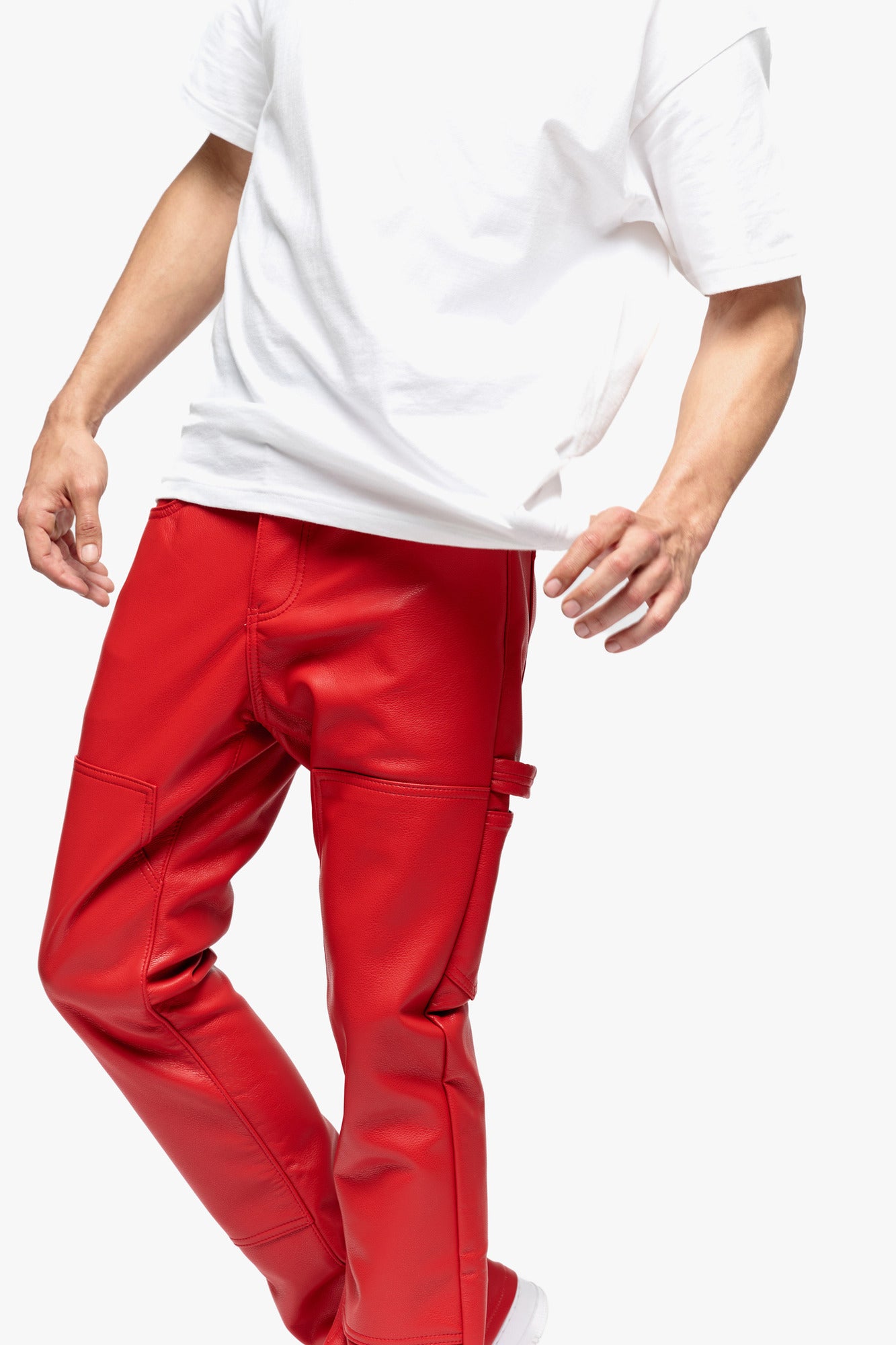 "Cuero" Red Leather Stacked Jeans – a striking stacked-leg silhouette crafted from bold red leather, designed for a statement-making look. The structured fit allows for natural stacking at the ankles, while precise stitching and a sleek finish enhance its modern, elevated aesthetic. A standout piece that fuses luxury with an edge.