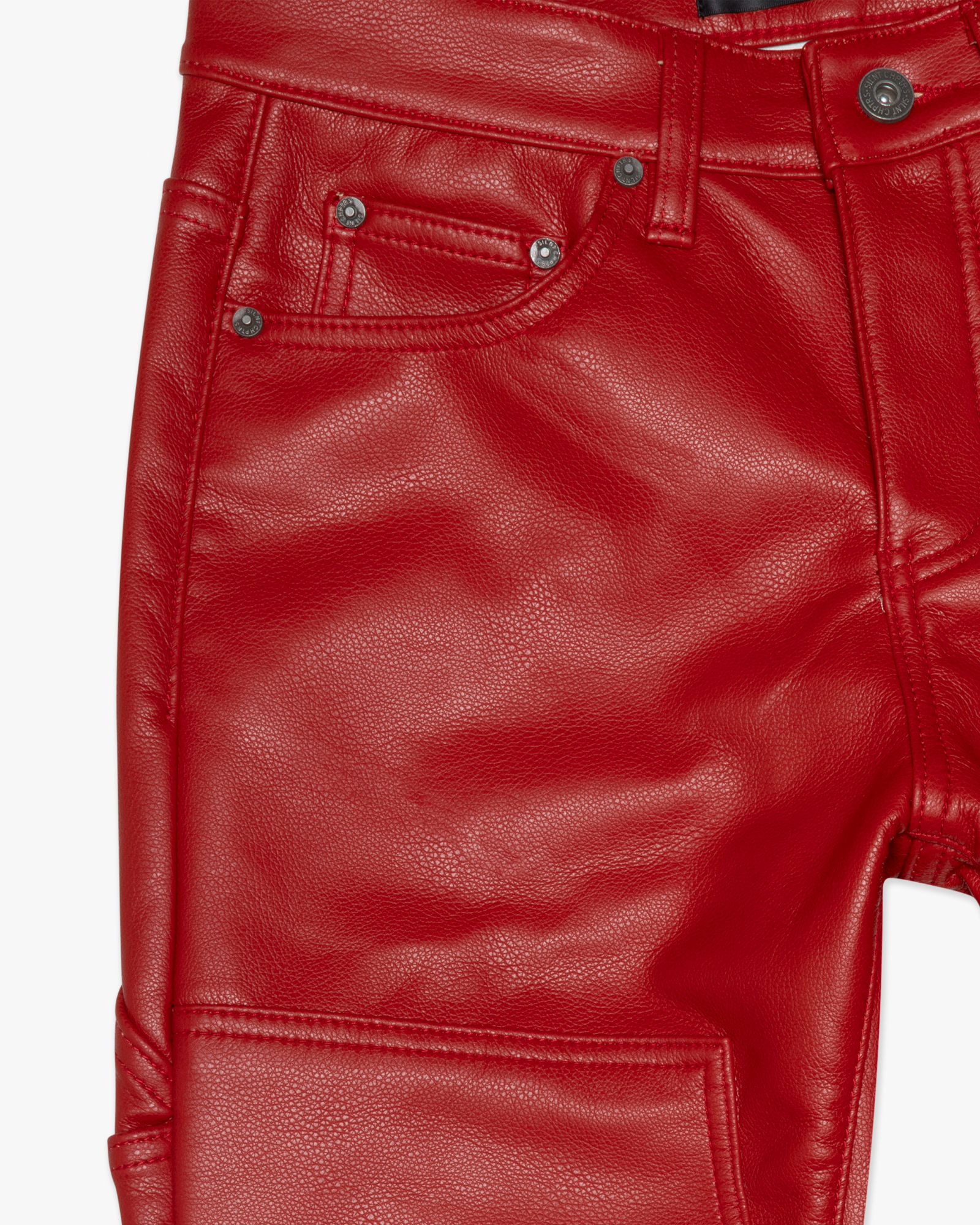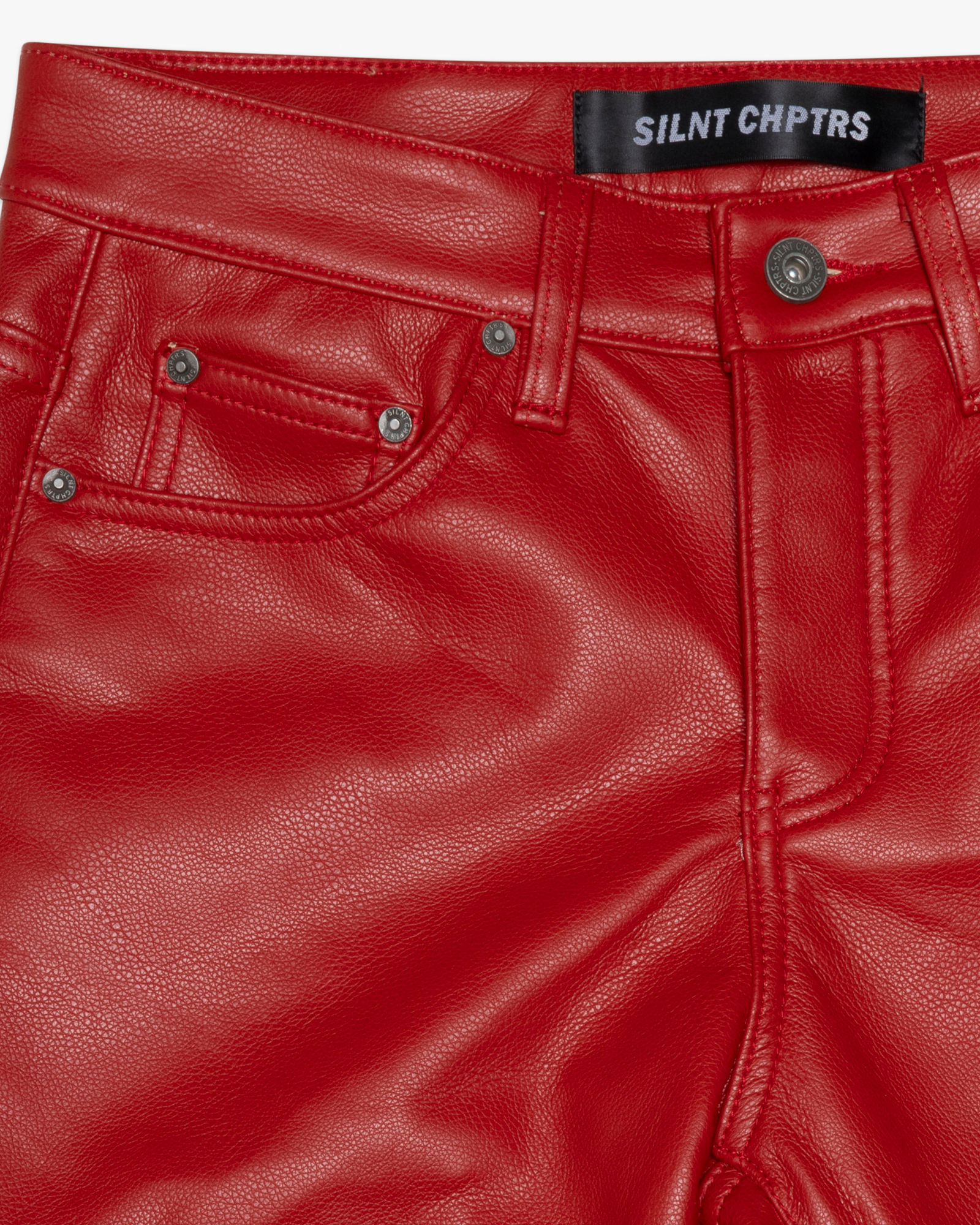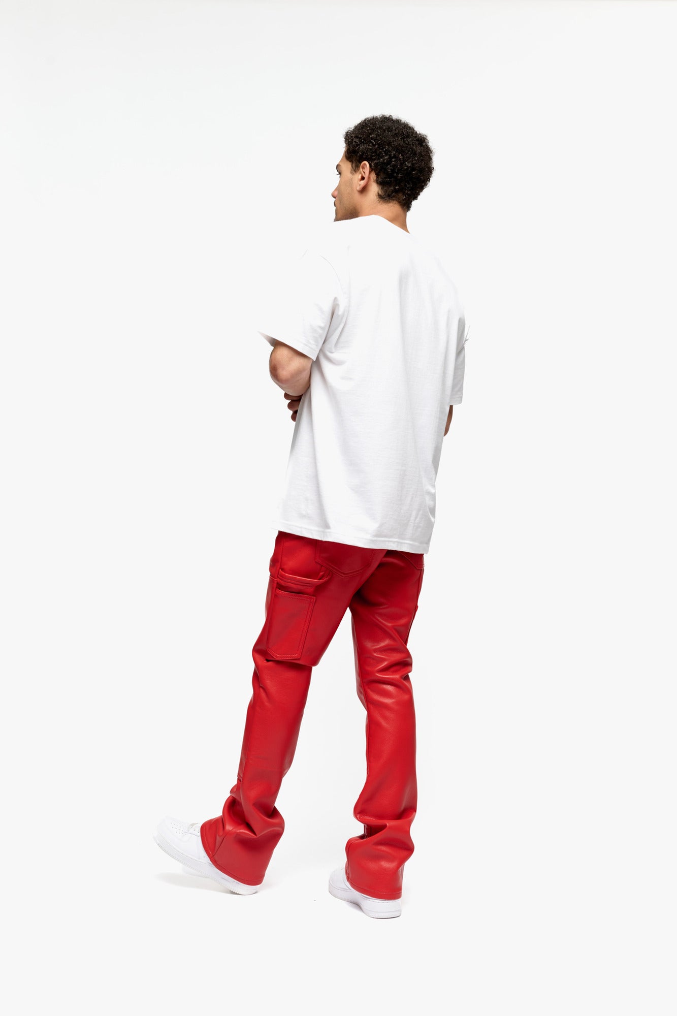 "Cuero" Red Leather Stacked Jeans – a striking stacked-leg silhouette crafted from bold red leather, designed for a statement-making look. The structured fit allows for natural stacking at the ankles, while precise stitching and a sleek finish enhance its modern, elevated aesthetic. A standout piece that fuses luxury with an edge.