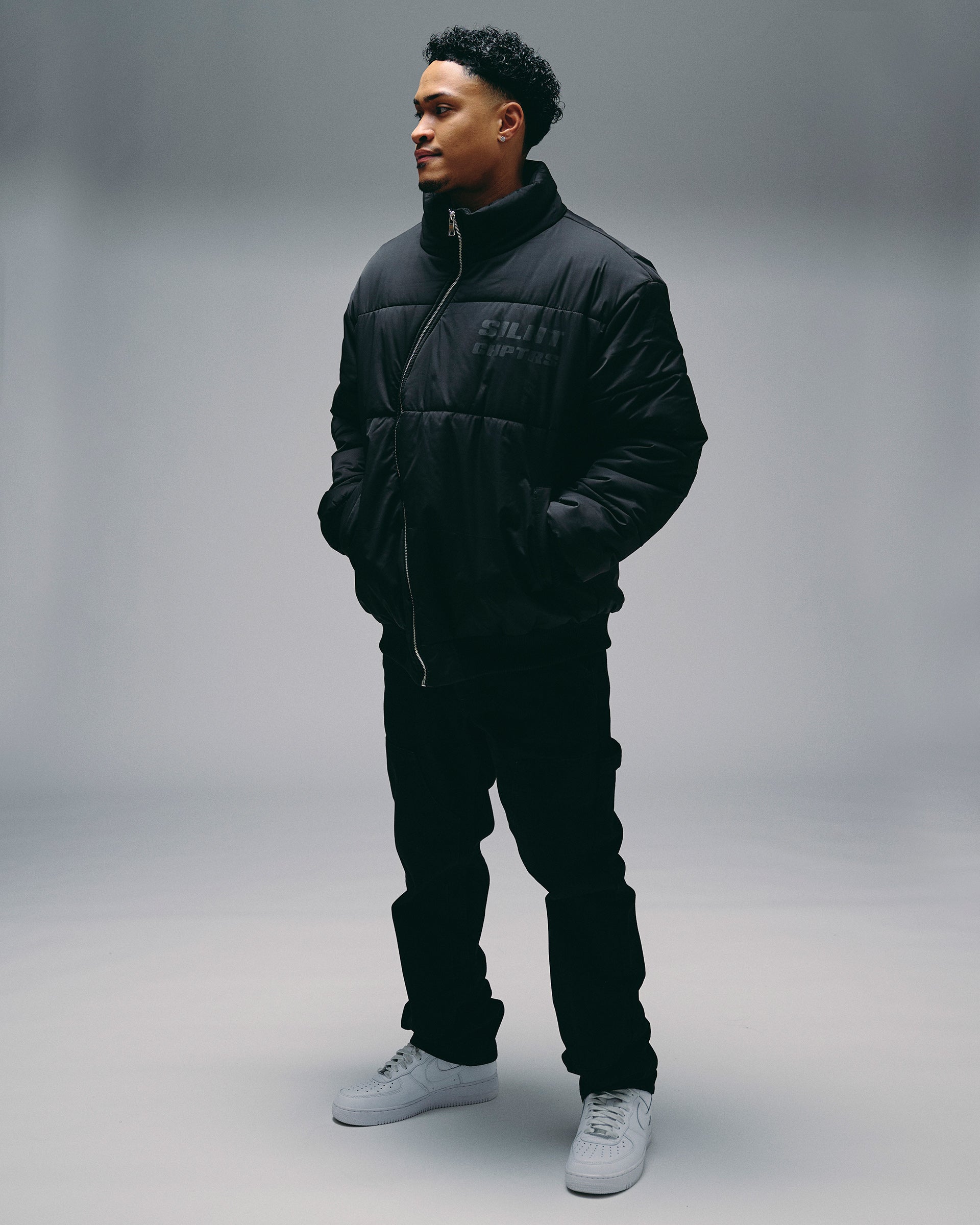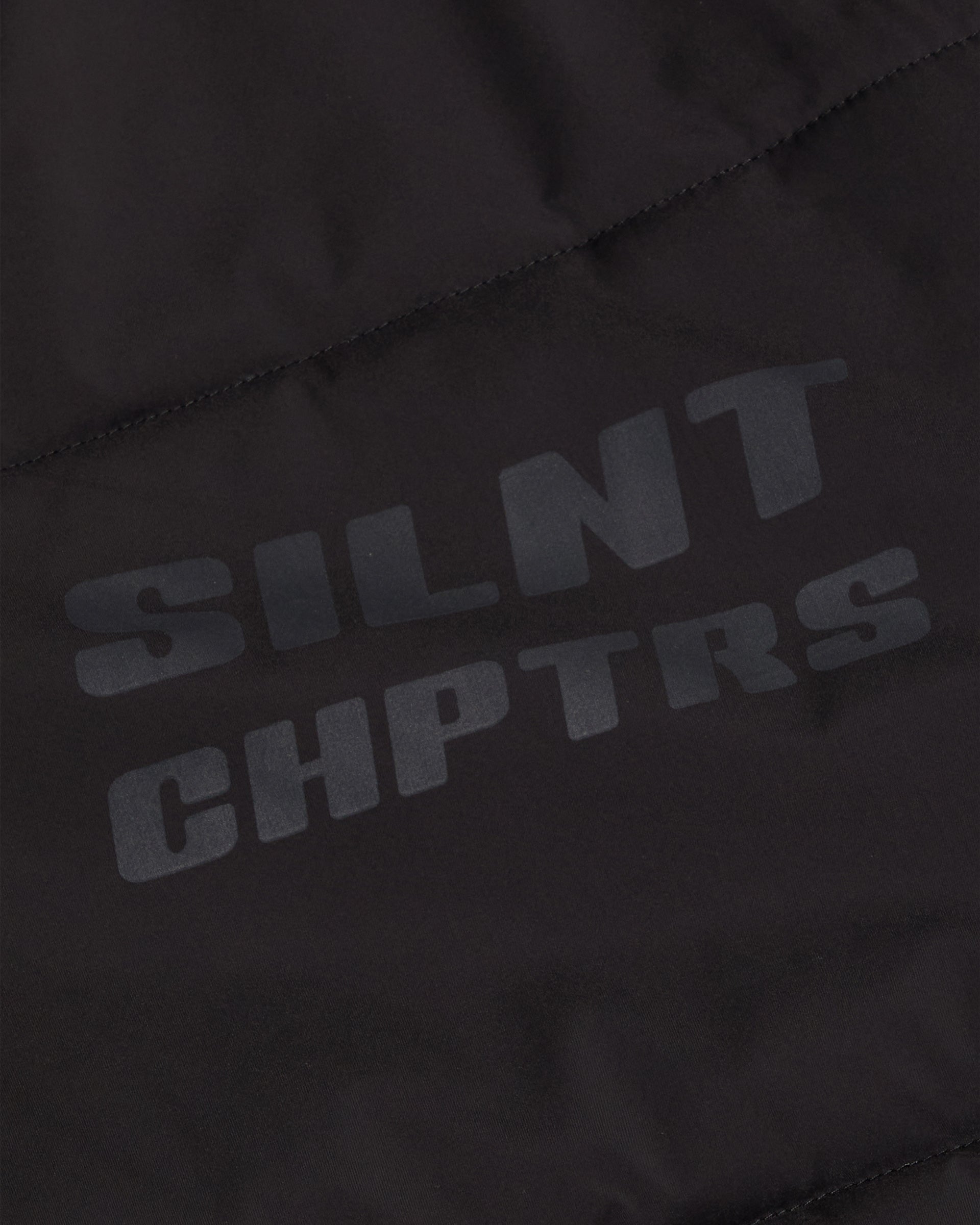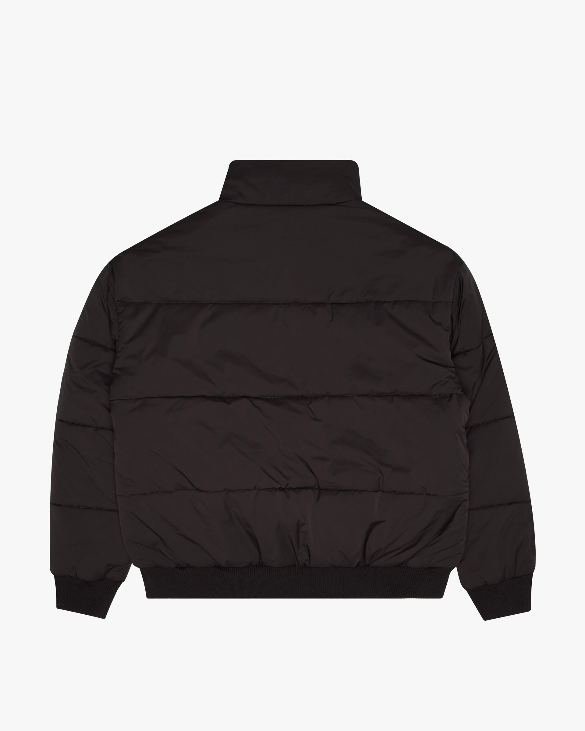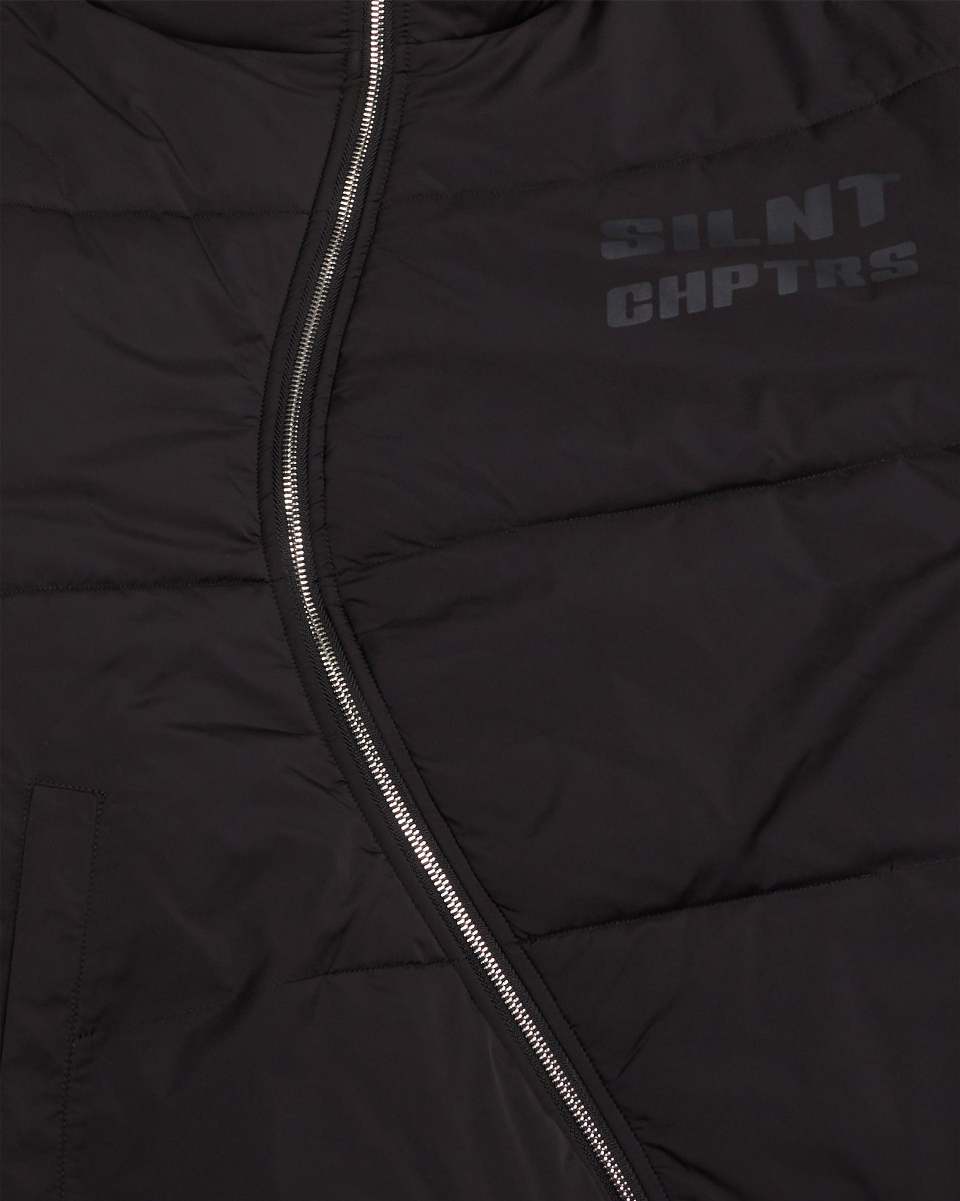 A bold take on cold-weather essentials, this asymmetrical puffer jacket combines a sleek silhouette with functional warmth. Crafted from durable black nylon, it features an "Irregular" quilted pattern that adds a distinctive, modern edge to its minimal design.