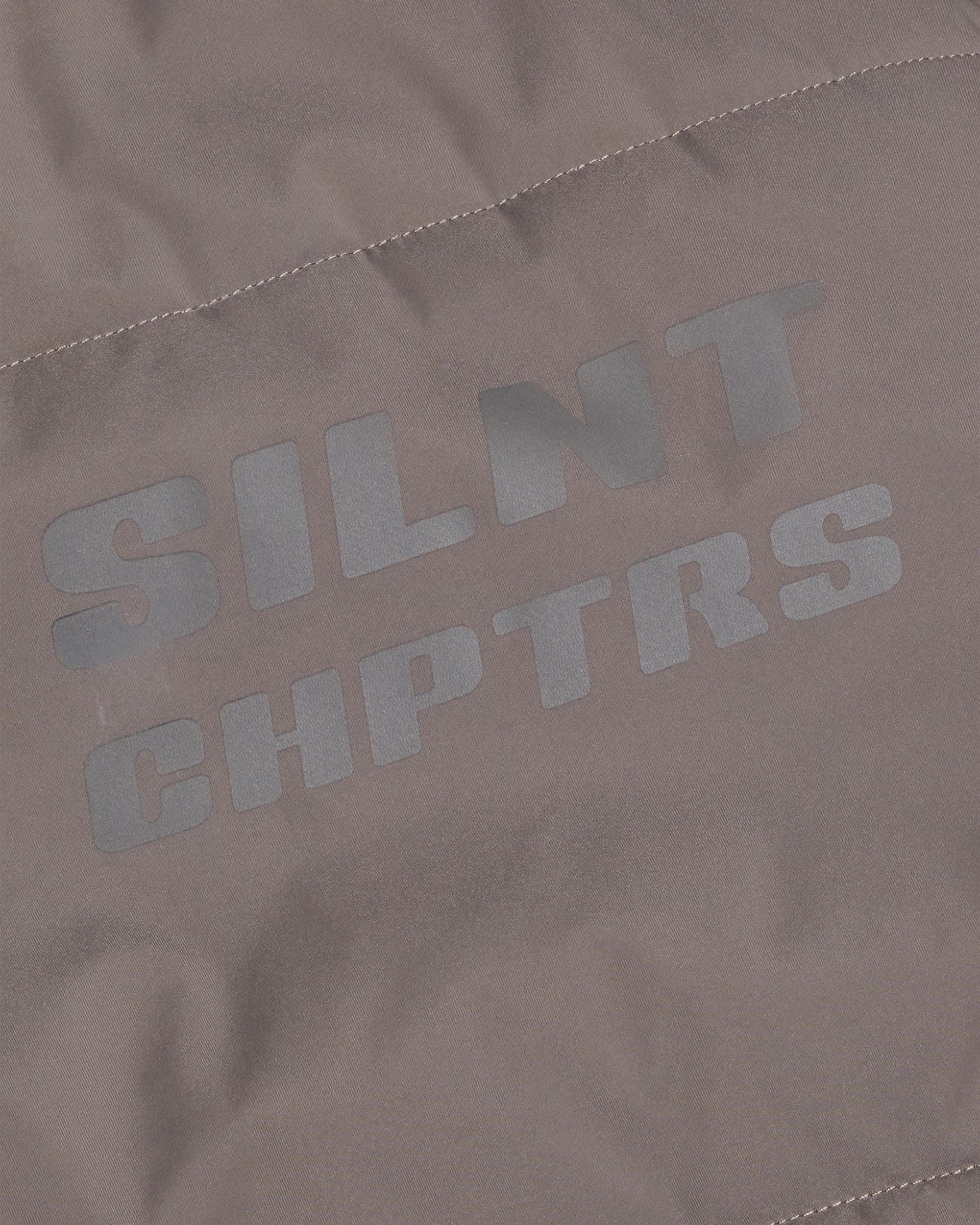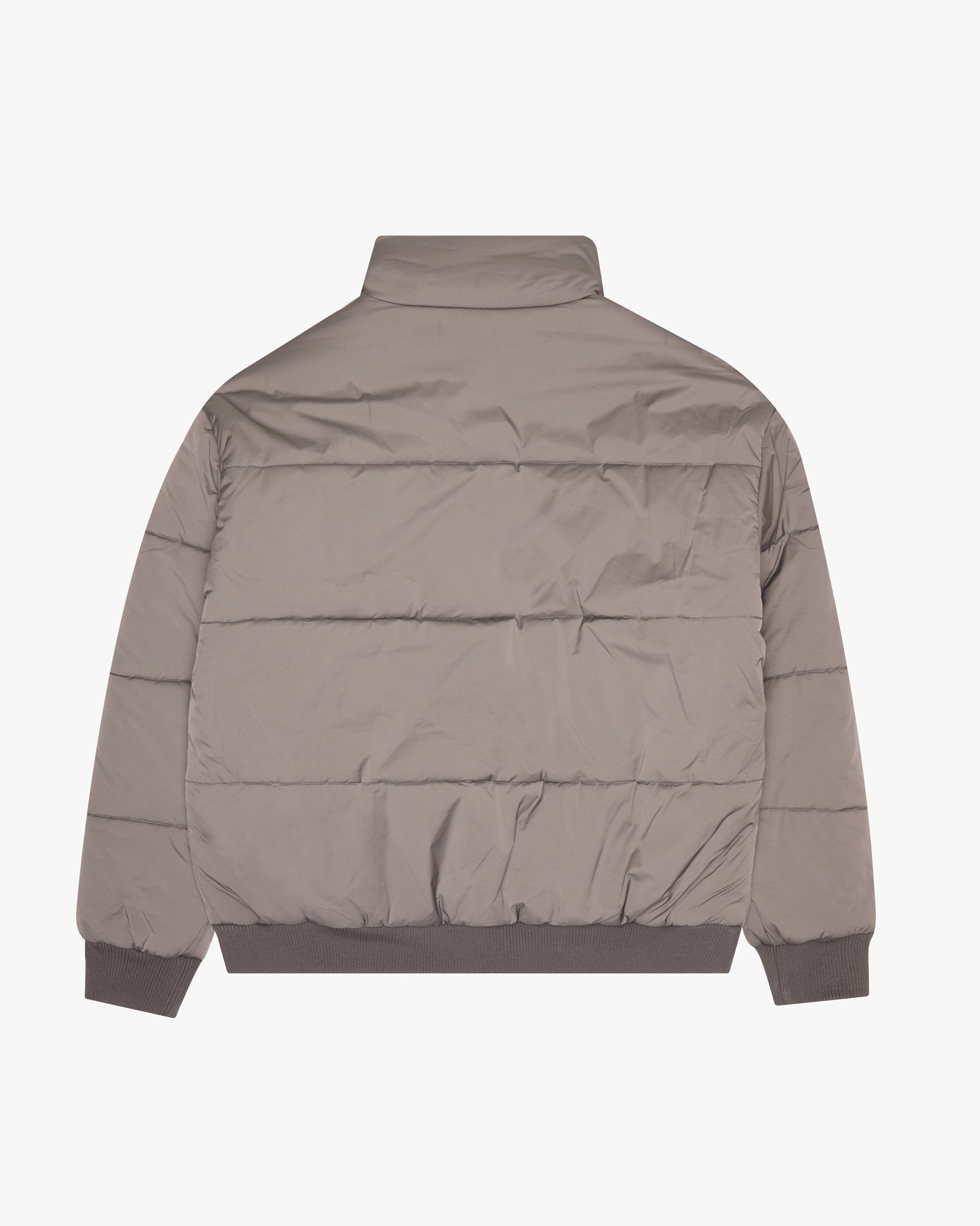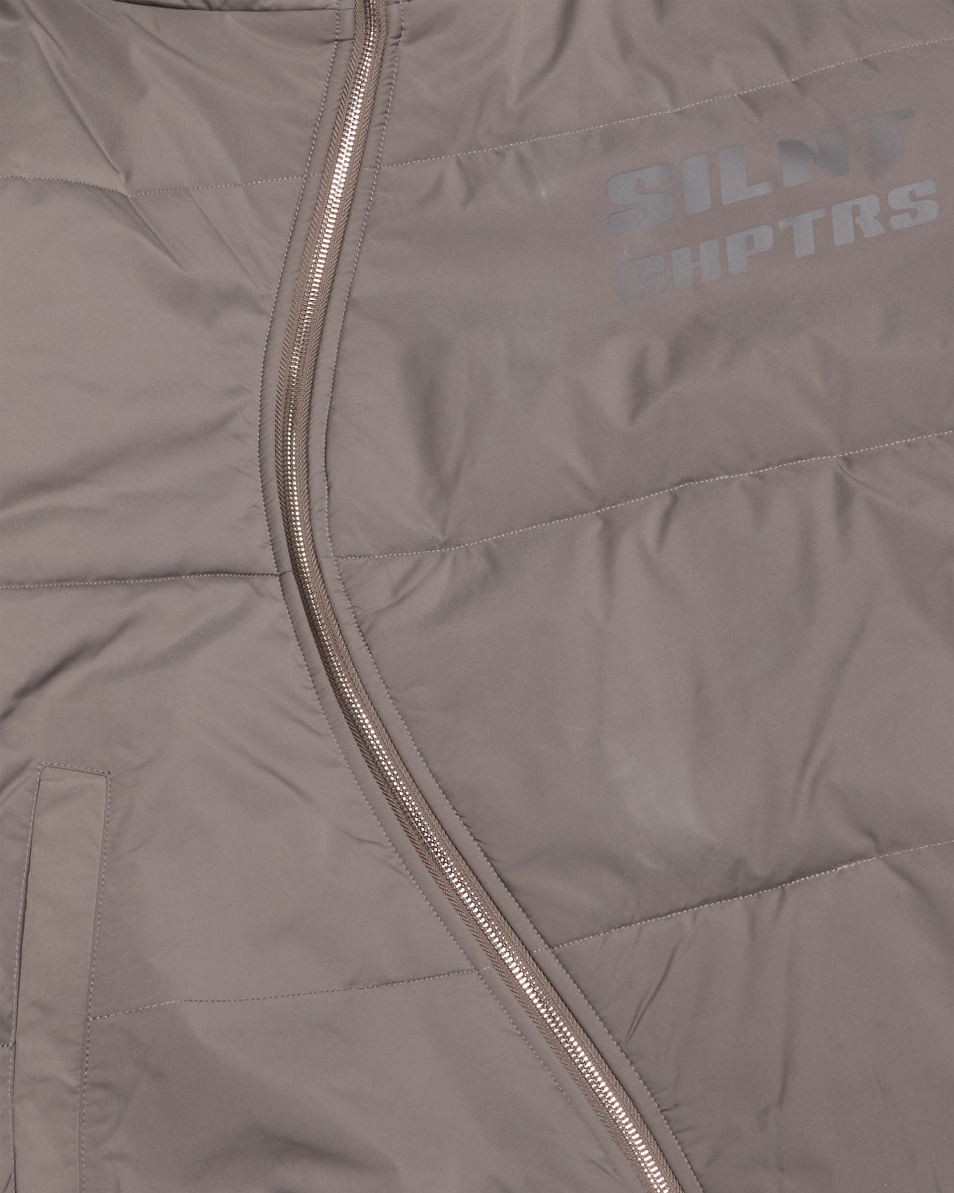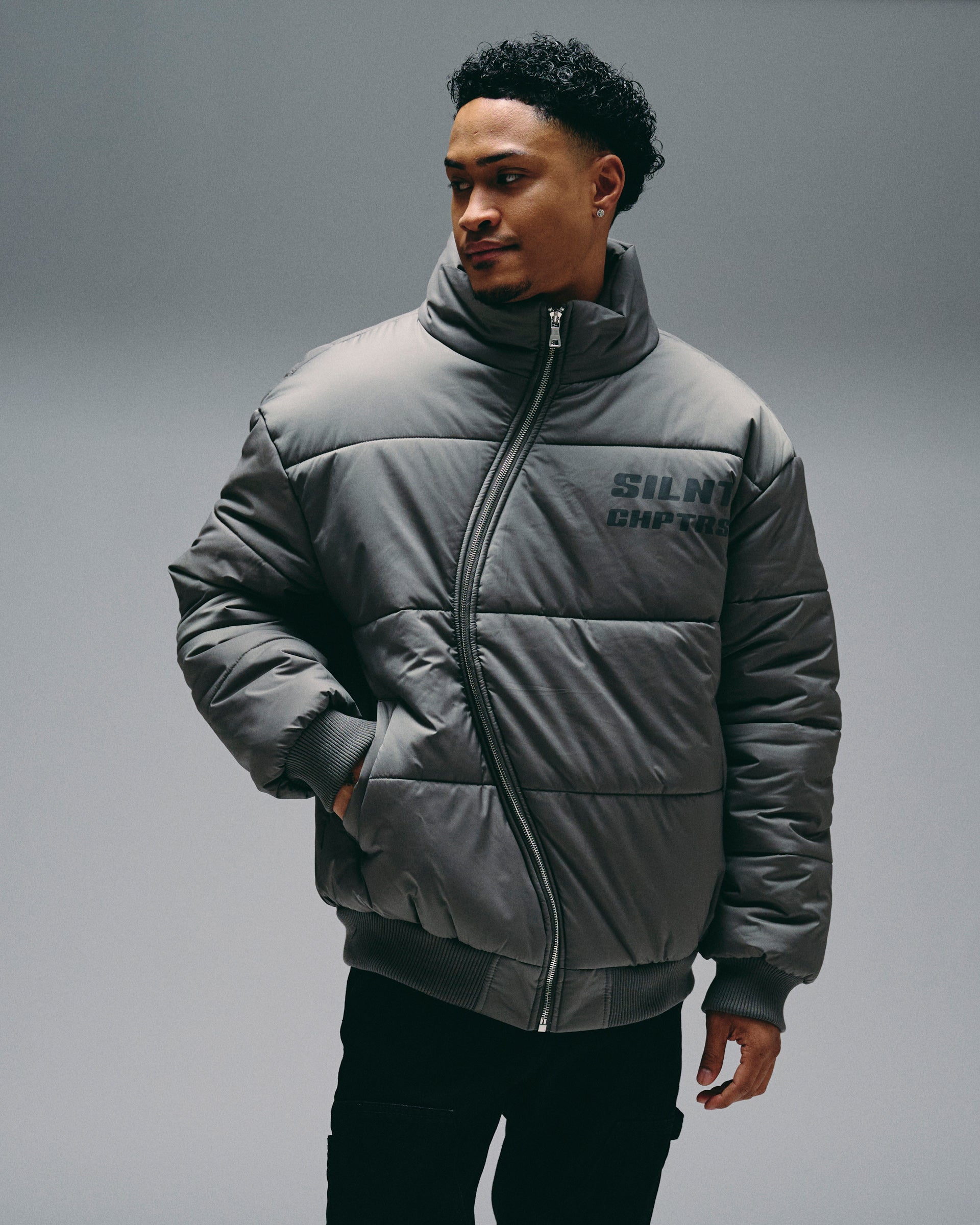 A bold take on cold-weather essentials, this asymmetrical puffer jacket combines a sleek silhouette with functional warmth. Crafted from durable grey nylon, it features an "Irregular" quilted pattern that adds a distinctive, modern edge to its minimal design.