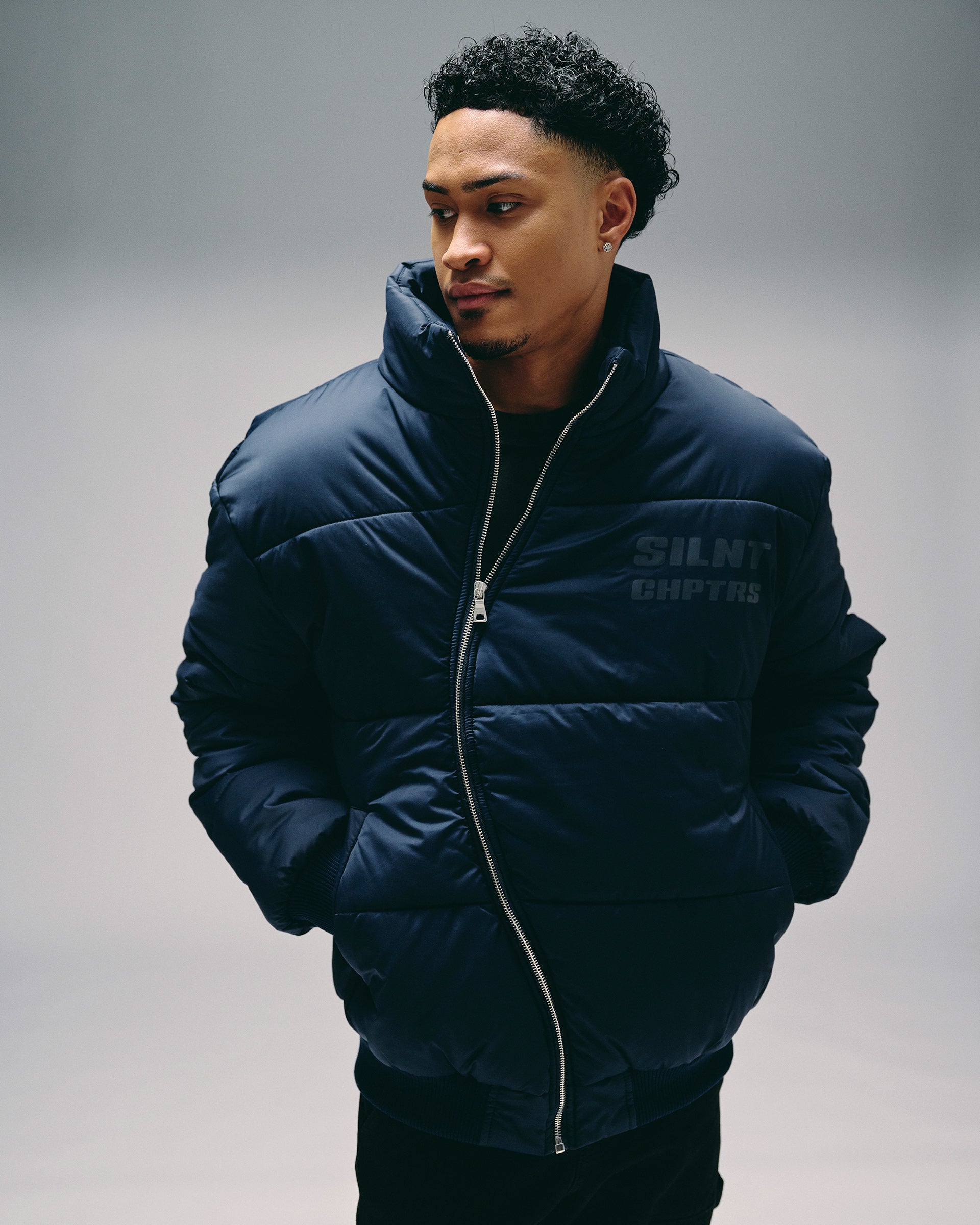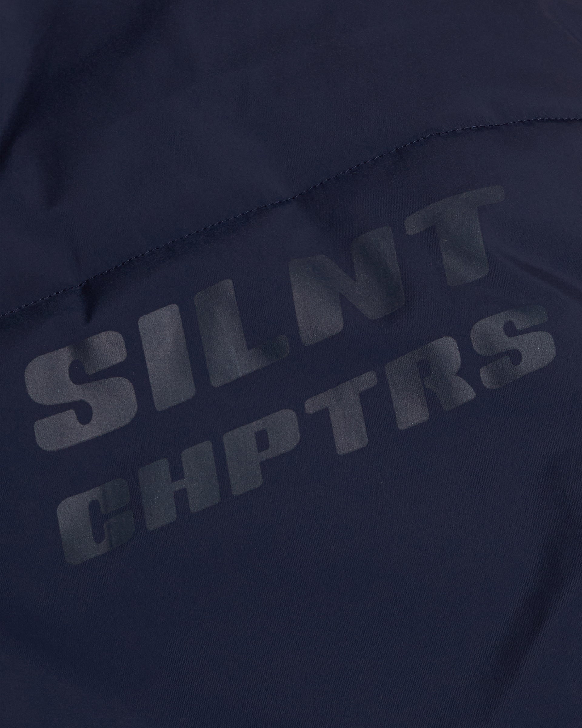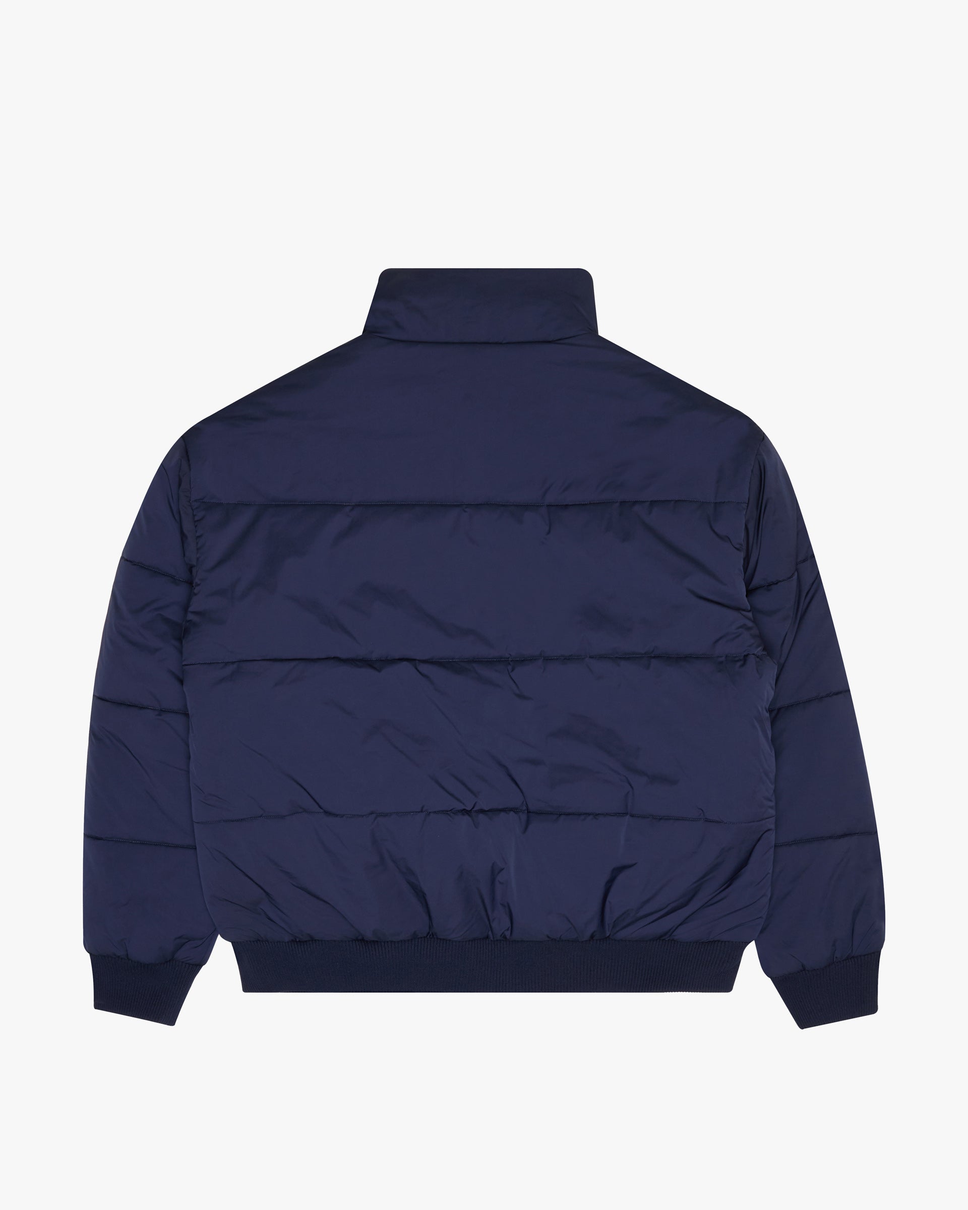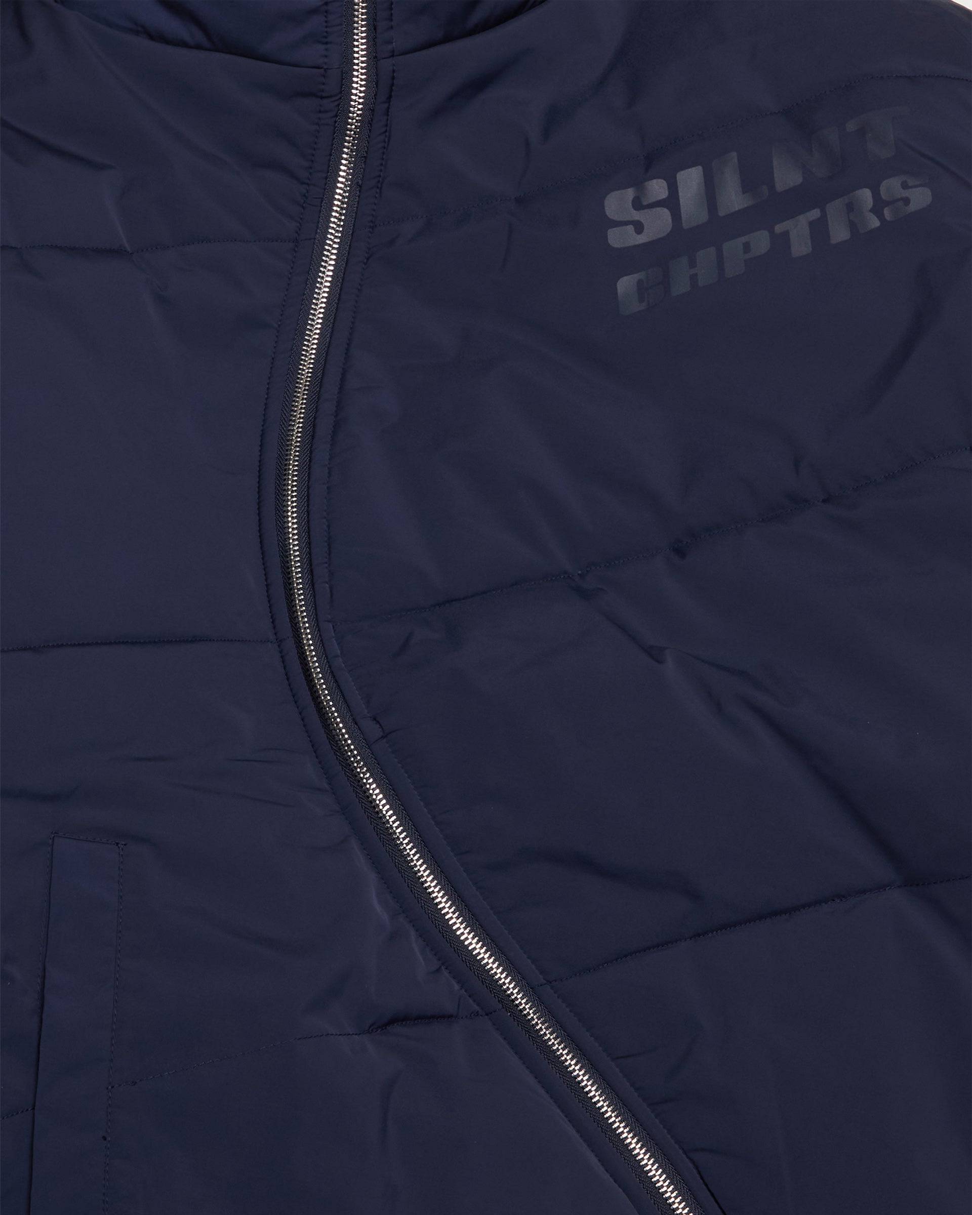 A bold take on cold-weather essentials, this asymmetrical puffer jacket combines a sleek silhouette with functional warmth. Crafted from durable navy nylon, it features an "Irregular" quilted pattern that adds a distinctive, modern edge to its minimal design.